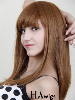Natural Human Hair Medium Brown Straight Style Long Length With Bangs