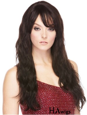 Cheap Human Hair Medium Brown With Bangs Wavy Style Long Length